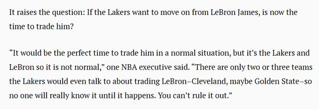 “换作是其他球队,现在绝对是交易他的完美时机,但这支球队是湖人,球员是勒布朗,一切就都变得不寻常了。”一位NBA高管表示,“湖人就算要交易勒布朗,也只会和寥寥两三支球队谈——克利夫兰骑士队是其一,金州勇士队或许也算一个。所以,不到交易真正发生的那一刻,没人能确定最终结果。这件事绝对不能排除可能性。”