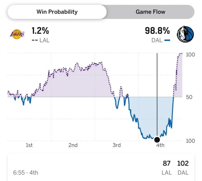 从本场的获胜概率走势图上你也能看出来剧情有多么炸裂,湖人前两节半都是更可能获胜的一方,结果第三节过半情况急转直下,落后最多时,湖人的获胜概率仅为1.2%,但他们依然完成了这1.2%的奇迹。