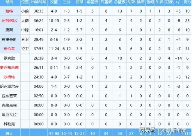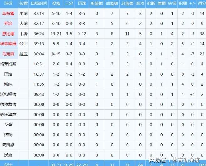 从数据层面清晰可见,恩比德凭借 38 分、11 个篮板以及 5 次助攻的出色表现,在面对以唐斯为核心的尼克斯内线群时占据上风,然而最终却未能带领球队获胜,只能无奈接受空砍结局。