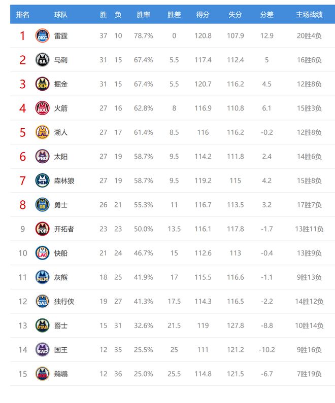 北京时间2026年1月26日,今日NBA有8场比赛,有2场比赛(掘金vs灰熊、独行侠vs雄鹿)因恶劣天气延期,另外6场正常举行,勇士、快船、雷霆、马刺、森林狼、太阳、国王、鹈鹕参与其中,赛后西部排名有何变化呢?