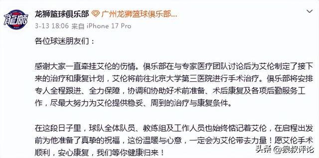 感谢大家一直牵挂艾伦的伤情。俱乐部在与专家医疗团队讨论后为艾伦制定了接下来的治疗和康复计划,艾伦将前往北京大学第三医院进行手术治疗。俱乐部将安排专人全程跟进、全力保障,协调和协助好术前准备、术后康复及各项后勤服务工作,尽最大努力为艾伦提供稳妥、周到的治疗与康复条件。