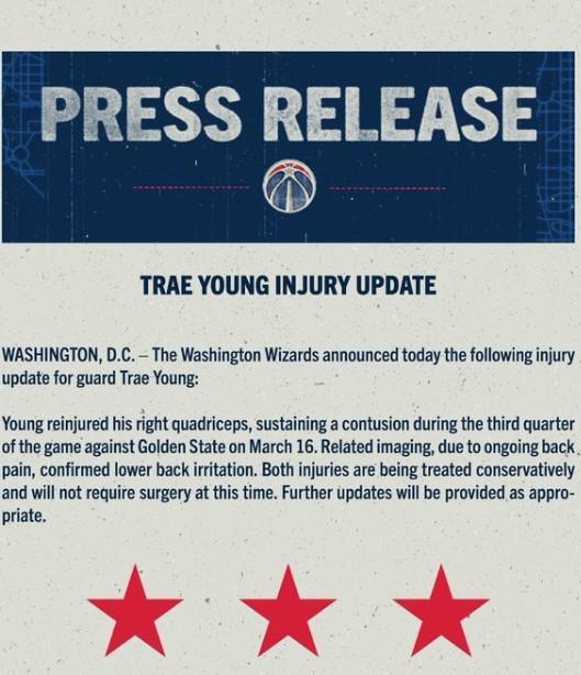 特雷-杨在3月16日对阵勇士的比赛中受伤,他的右股四头肌挫伤,同时他还出现了下背部反复刺激的情况。这两处伤病都将采用保守治疗的手段,不会进行手术。后续伤情将视情况公布。