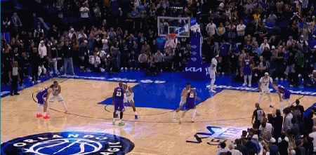 最后2秒,湖人前场发球,老詹直插篮下一下就带走两人,就在这一瞬间,肯纳德从右侧45度角悄咪咪溜到左侧45角,聪明哥心领神会,球长了眼睛一样飞到他的手里。