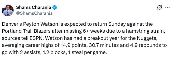 掘金前锋佩顿-沃特森因右腿腿筋拉伤缺席六周多后,预计将在周一对阵波特兰的比赛中复出、可以登场。