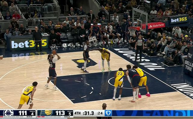 先是步行者一方发球,结果直接把球扔进了篮筐,裁判判罚罚球违例;随后快船发球,马瑟林被犯规后又是两罚不中,接着步行者再次发球,胡夫被犯规后获得绝杀罚球机会,结果又是两罚全丢,然后比赛哨响结束。