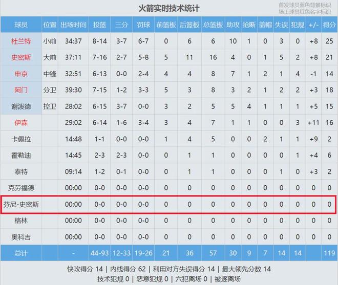 3月22日火箭123-122险胜热火,芬尼-史密斯替补出战14分钟,2投0中,罚球2中1拿到1分1板3助0断。过去7场,芬尼-史密斯合计19中5,投篮命中率只有26.3%。很多火箭球迷期待他能在赛季收官阶段爆发,没想到如今被弃用了。