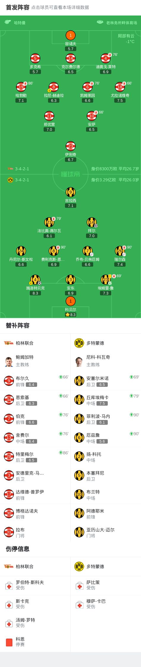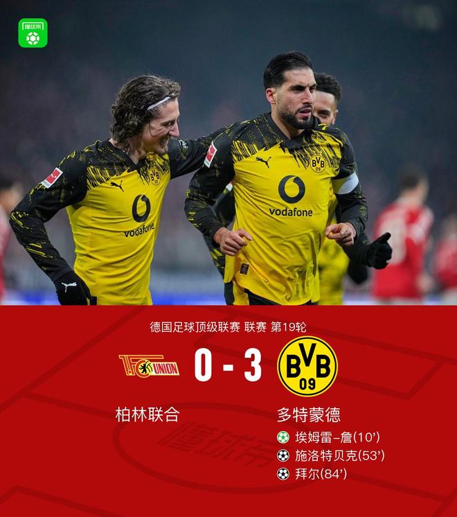 北京时间1月25日,德国足球顶级联赛第19轮,柏林联合主场对阵多特蒙德。埃姆雷-詹主罚点球命中,为多特蒙德首开纪录;随后瑞尔森送出助攻,施洛特贝克破门扩大比分;乔布-贝林厄姆送出助攻,拜尔再入一球。最终多特蒙德客场3比0战胜柏林联合。