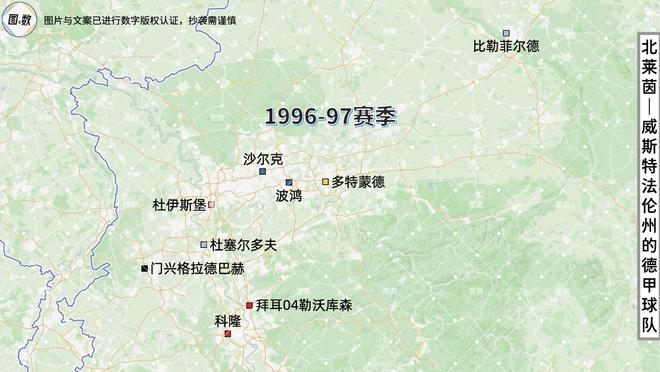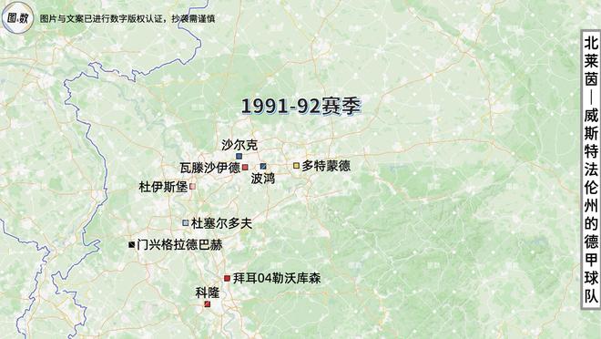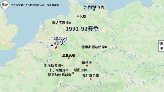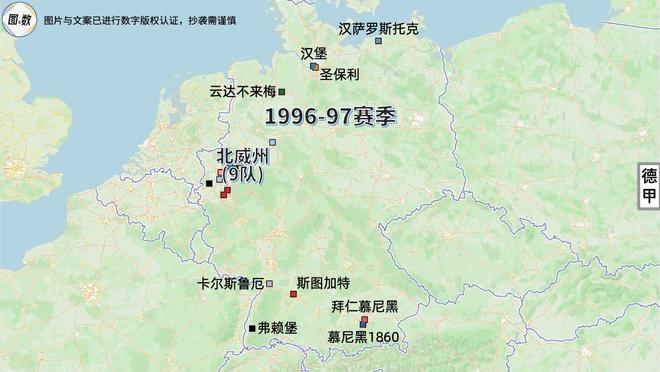 即使是德国统一后,北威州也曾两次同时拥有9支德甲球队:一次是在1991-92赛季,当时的德甲为照顾东德,临时扩充为20队;另一次是在已经恢复18队的1996-97赛季,北威州的9队是真正占据了德甲的“半壁江山”。