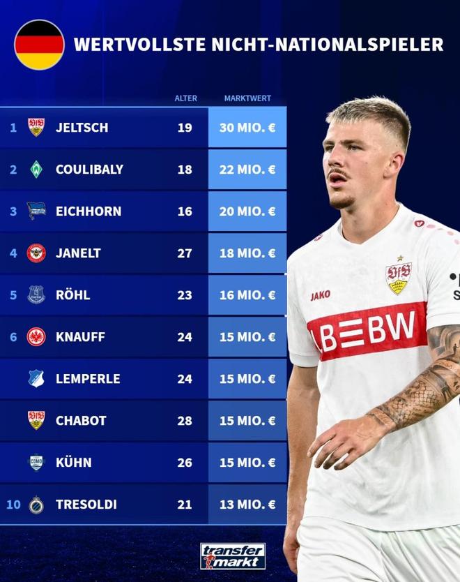 从未入选德国队球员身价榜:斯图加特后卫耶尔奇3000万欧居首