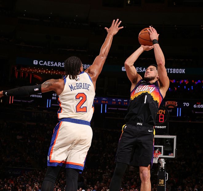 太阳客场挑战尼克斯,太阳少了杰伦格林,尼克斯少了布伦森、哈特,尼克斯首节赢了8分,从第二节开始太阳占据上风,最终太阳以7分优势击败尼克斯。布克18中7得到27分4板4助,马威8中5得到14分9板,古德温6中5(三分4中3)得到13分3板3助2断,尼克斯方面唐斯16中7得到23分11板2助,麦克布莱德18中9(三分12中5)得到23分2板5助,阿努诺比17中6得到21分8板5助3断。