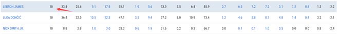 勒布朗-詹姆斯自年满41岁后已经打了10场比赛,这十场比赛他场均33.4分钟,拿到25.6分7.2篮板7.2助攻1.2抢断0.8盖帽,命中率51.1%,三分命中率33.9%,这对于一位41岁的老将来说已经是绝无仅有的存在。