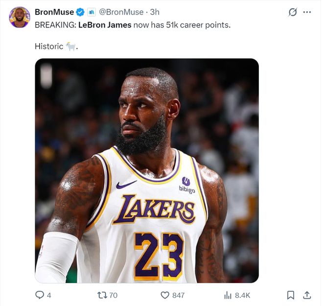 美媒LH写道:重大消息,勒布朗-詹姆斯达成51000分里程碑,钦佩他的伟大之处GOAT。