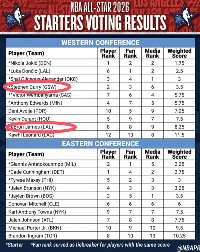 全明星首发要考虑的是三个方面,球员投票,球迷投票和媒体投票,最终三方面来算一下总分,分最高的前五自然能够入选先发。
