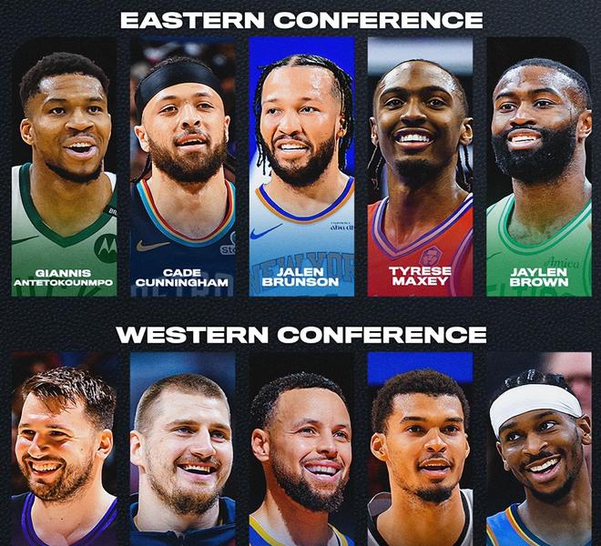 距离2026年洛杉矶全明星周末不足一个月,NBA联盟官方率先公布了本届全明星首发阵容,具体如下:西部全明星首发——东契奇+约基奇+亚历山大+库里+文班亚马,东部全明星首发——字母哥+布伦森+马克西+康宁汉姆+杰伦布朗。长江后浪推前浪,一代新人换旧人,这套全明星首发阵容包含老中青三代球星,有东契奇、约基奇、库里、字母哥等全明星首发常客,也有杰伦布朗、马克西、文班亚马和康宁汉姆等全明星首发新面孔,可谓是星光璀璨,相得益彰。