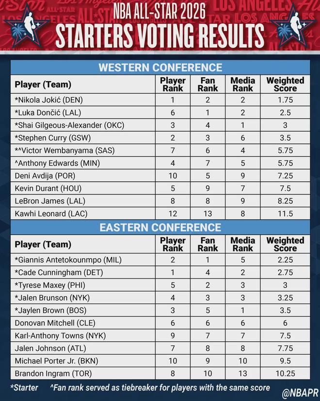 杜兰特在球迷投票中排名西部第9,球员投票排第5,媒体投票排第7,最终排名西部第8。比较遗憾的是爱德华兹:球迷投票仅排西部第7,球员投票西部第4,媒体投票西部第5。华子最终得分和文班持平,因球迷投票处于劣势而落选。
