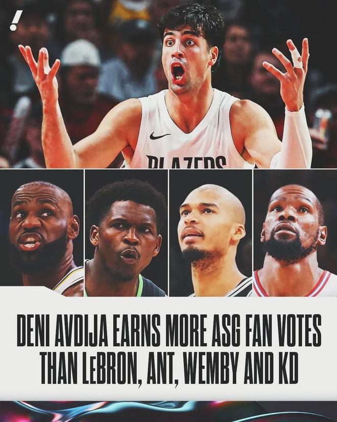 最让人意外的是开拓者球员阿夫迪亚,他在球迷投票中高居西部第5。球员投票排在西部第10,媒体投票排在第9,最终排名西部第7,力压杜兰特和詹姆斯。由于今年是美国队vs国际队,所以阿夫迪亚大概率会入选国际队的替补阵容。