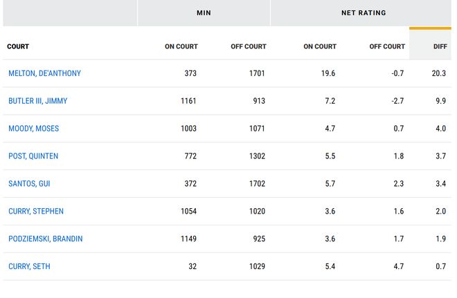 巴特勒本赛季场均20分5.6板4.9助1.4断,命中率51.9%,他本赛季的总正负值+185全队第一,他是否在场,对勇士的净效率影响为+9.9,排名全队第二,第一是梅尔顿,他的净效率影响高达+20.3,不过梅尔顿的出战时间比巴特勒少很多(巴特勒是1161分钟,梅尔顿是373分钟),在出场时间多的球员里,巴特勒净效率影响遥遥领先,远超库里的+2。