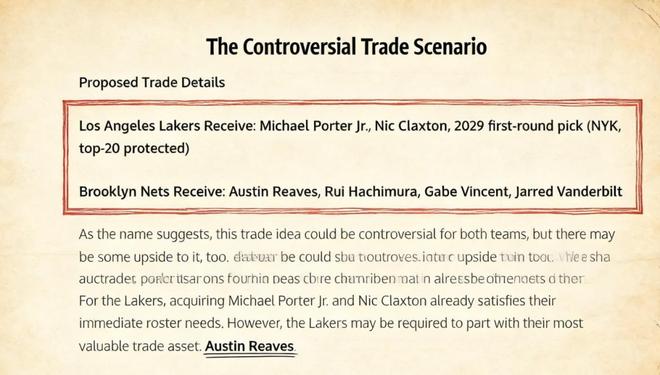 美媒《Fadeaway World》撰文建议,湖人可以将里夫斯、八村垒、文森特以及范德比尔特送到布鲁克林,换回小波特、克拉克斯顿以及2029年首轮签(前20顺位保护)。