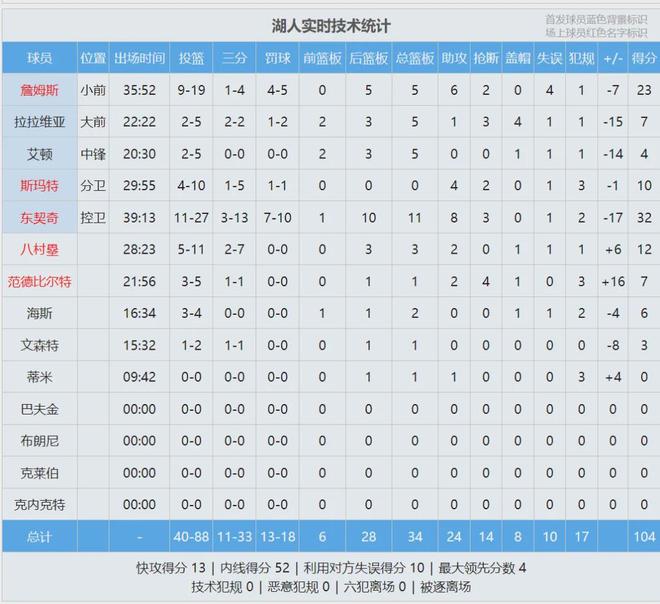 东契奇32分11板8助3断、詹姆斯23分5板6助2断4失误。祖巴茨抢了10个前场篮板,湖人全队只有6个。最后看看数据,说说你的心情:
